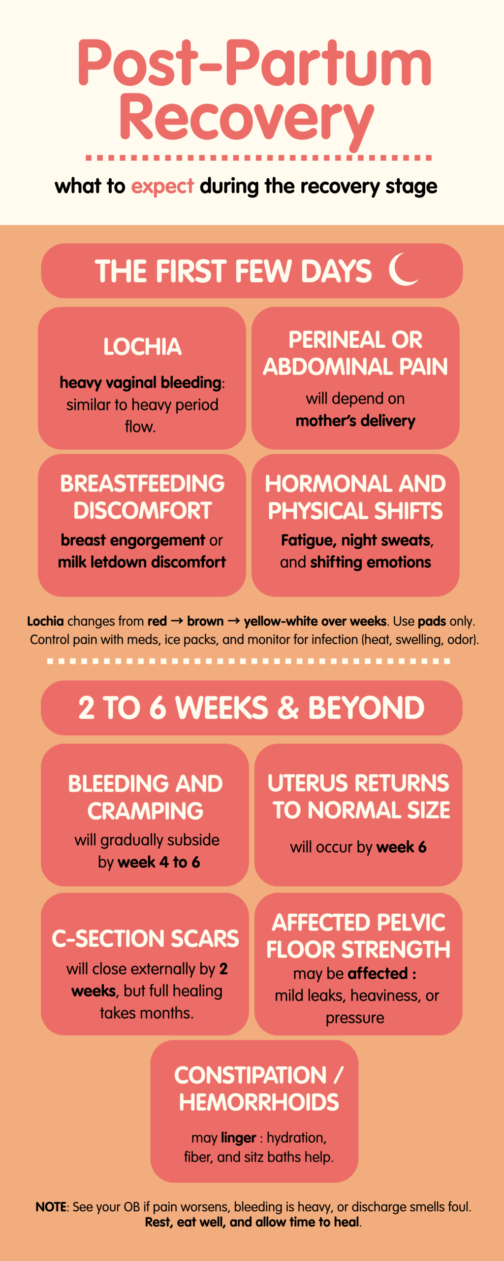 Lochia starts red, then turns brown, then yellow-white over several weeks. Use maternity pads — not tampons — and monitor for clots larger than a coin or foul-smelling discharge.