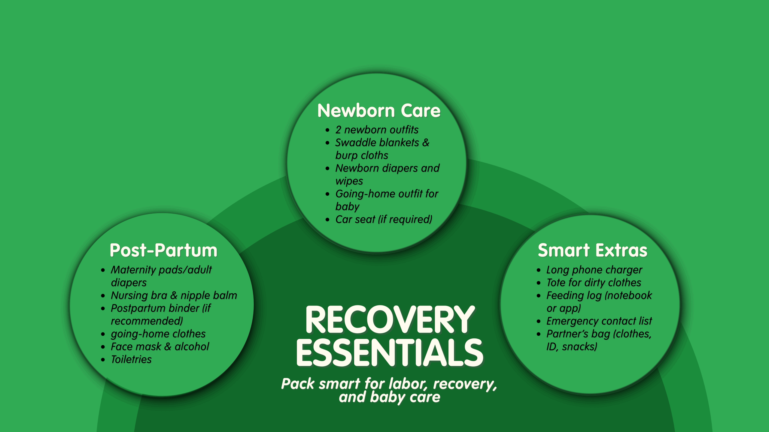 - Pack for labor, postpartum recovery, and newborn care — not just clothes.
