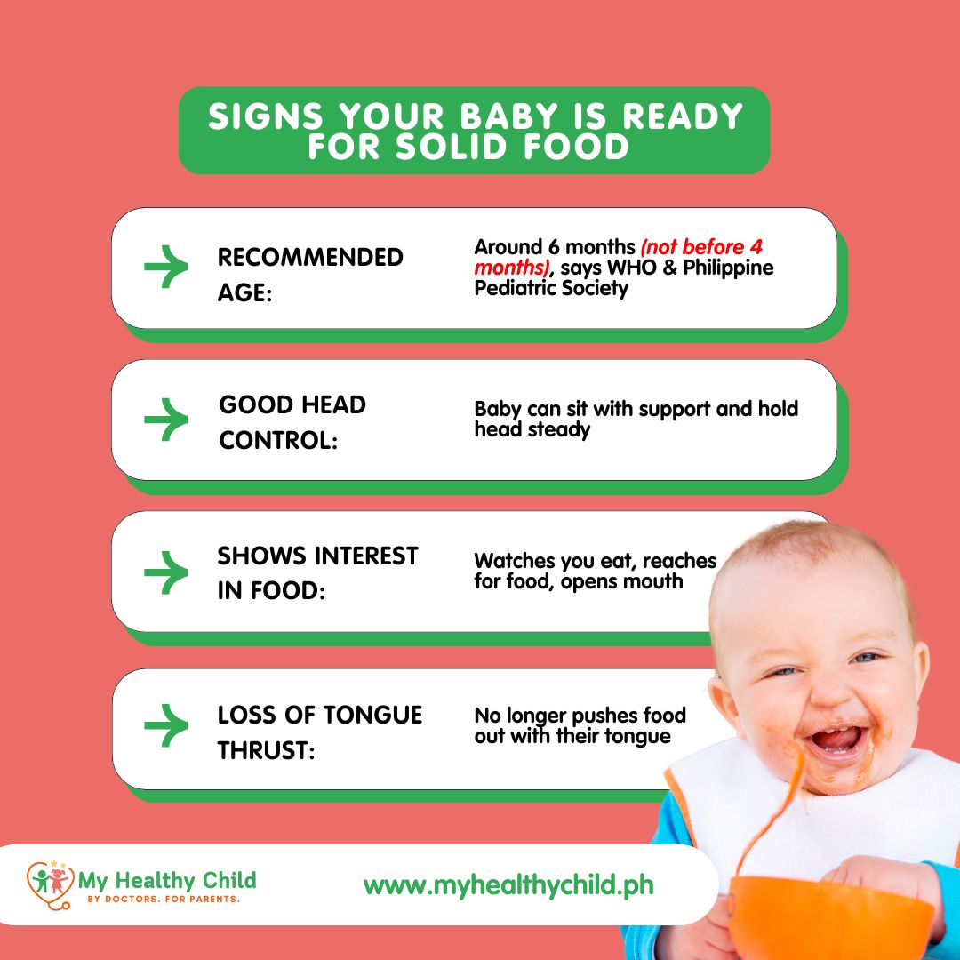 - Age: WHO and the Philippine Pediatric Society recommend introducing solids at 6 months, but not before 4 months